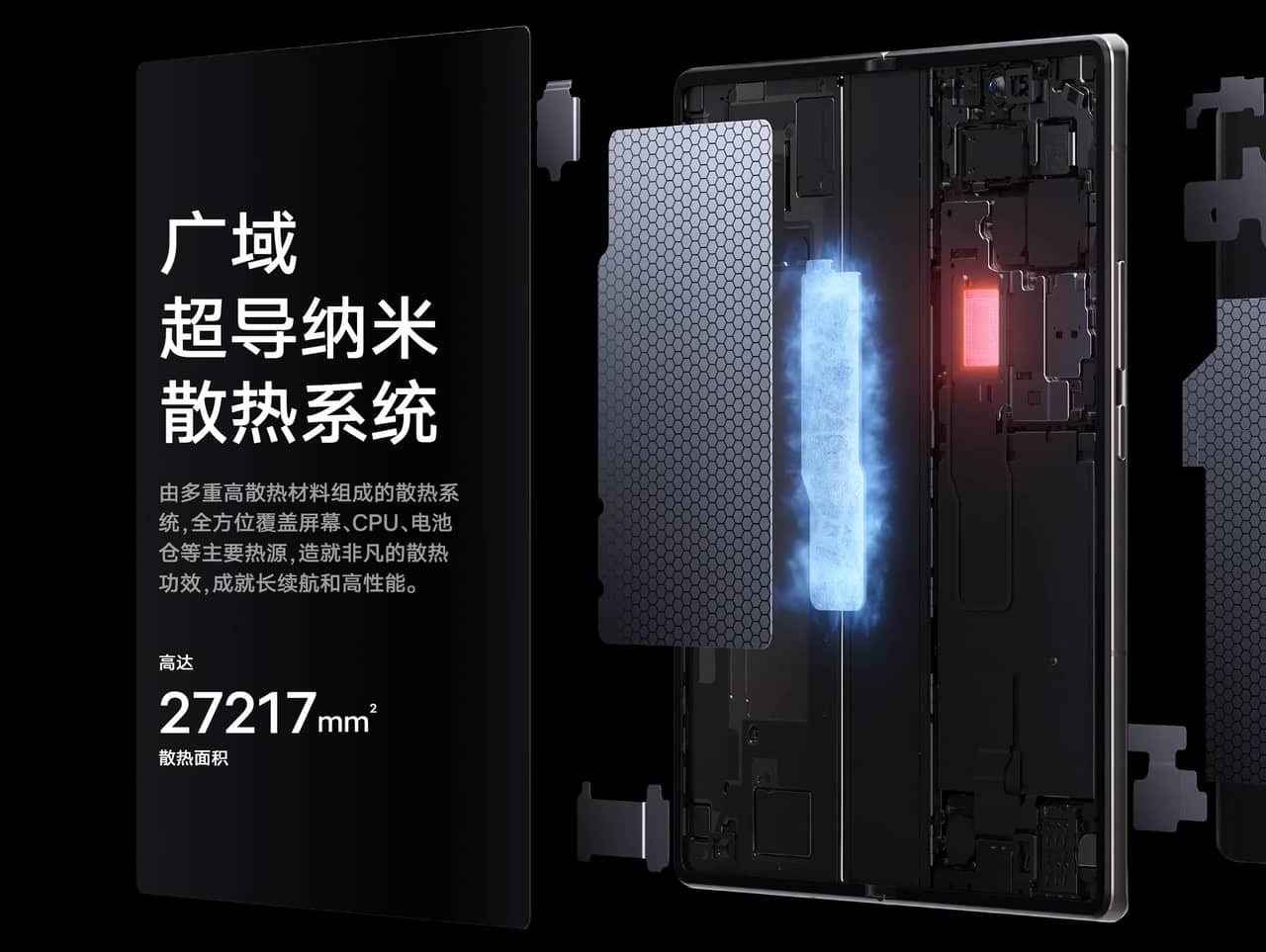 ▼ハイエンドチップゆえ発熱による動作速度低下が懸念されるが、Vivo X Fold+は広範囲に放熱板を敷き詰めており、CPU周りを徹底的に冷却するという仕組みになっているぞ!↓
