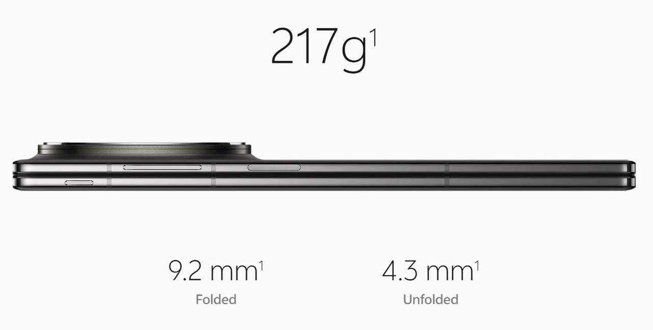 ▼重量は217g。折りたたみ時は9.2mm、展開時は4.3mmとかなり薄い!今年は折りたたみスマホの進化(薄型・軽量化)が凄まじいですね。↓