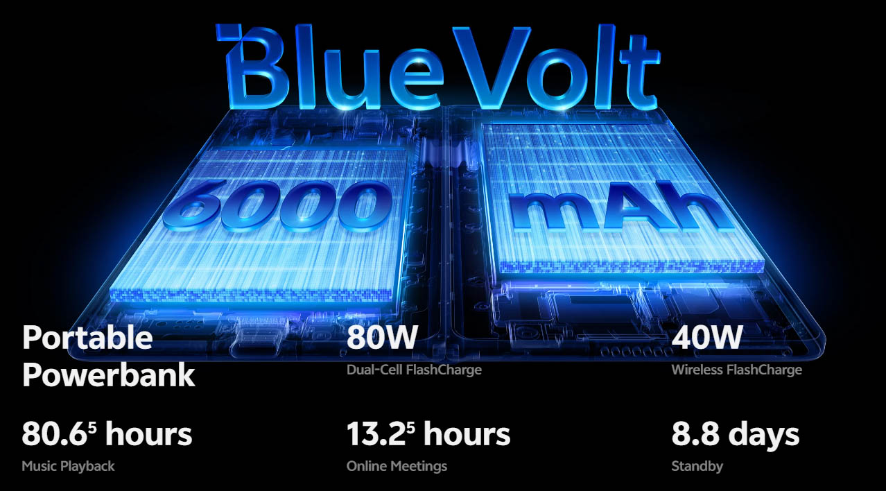 ▼バッテリー容量は6000mAh。80W(FlashCharge)の有線充電だけでなく、40W(FlashCharge)のワイヤレス充電にも対応しています。↓
