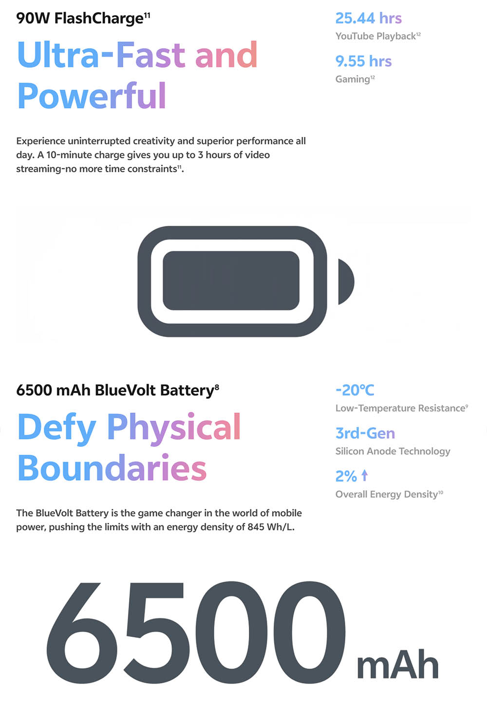バッテリーは6500mAhとコンパクトサイズのスマホにしては大容量です。90W(FlashCharge)の急速充電に対応しています。