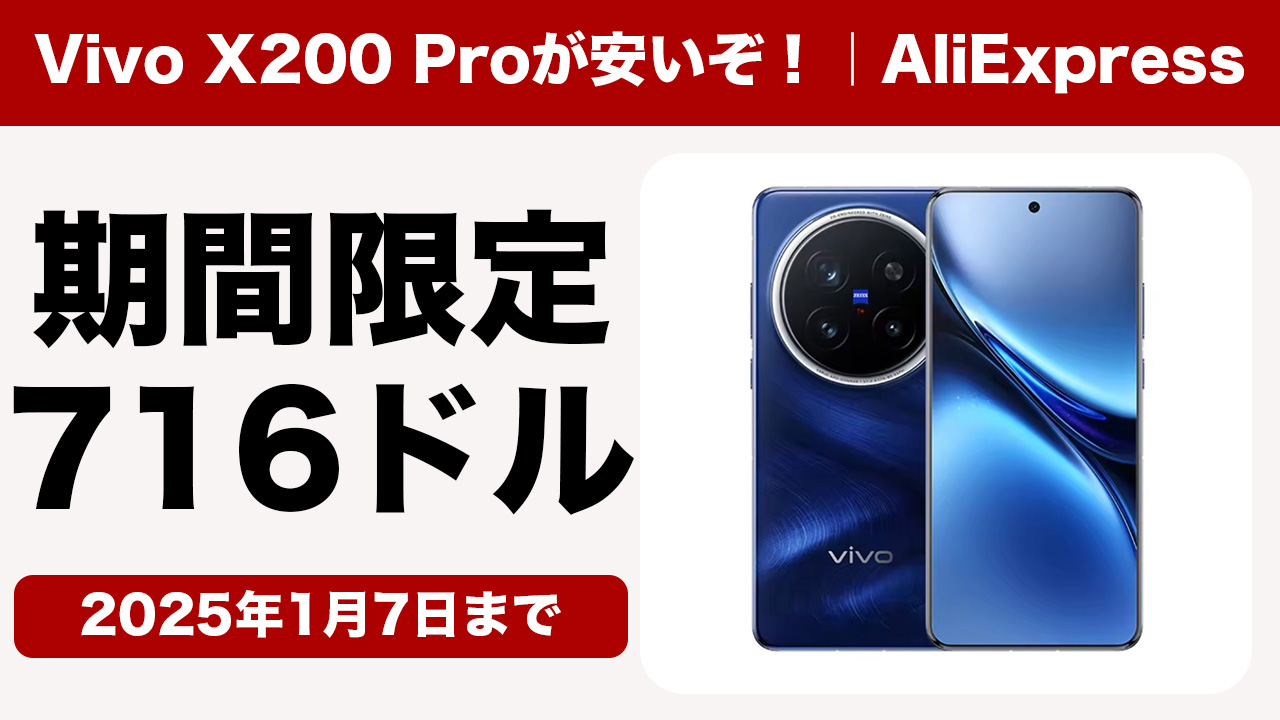 安!Vivo X200 Proがアリエクセールで716ドル(約11.3万円)!1月7日まで!