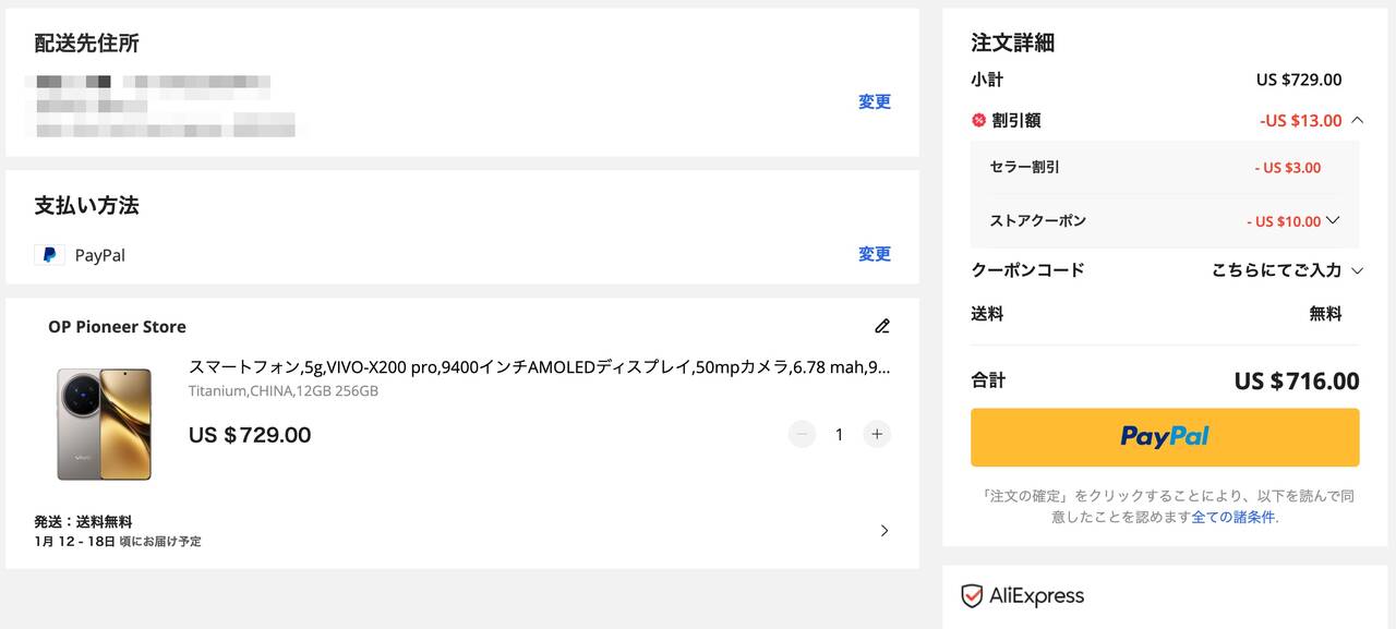 Vivo X200 ProはAliExpressで1月7日までセール中!クーポンを適用することで716ドル(約11.3万円)とかなりお安くなってます。
