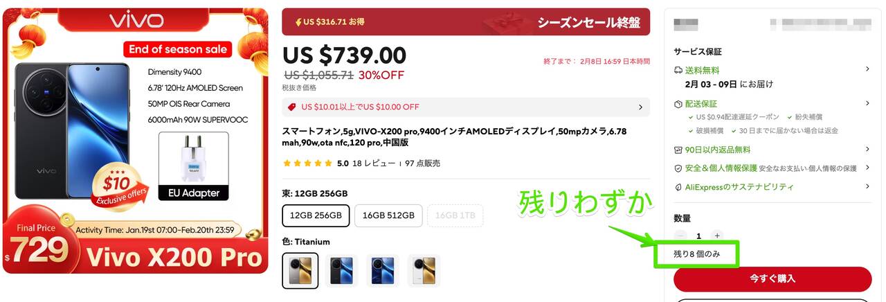 AliExpressでシーズンセールがスタートしたんですが、vivo X200 Proが再びセール価格になってます!前回の初売りセールでタイミングが合わなかった方はお見逃し無く!なお執筆時点で在庫8台でした。(無くなってたらすみません…。)