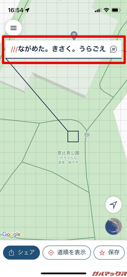 ▼マス目をタップすると、そのマス目に割り当てられた「3つの単語」が表示される。俺が指定した場所も、いま記事を見ている人がwhat3wordsで同じ単語で検索すると瞬時に場所が分かるはずだ。↓