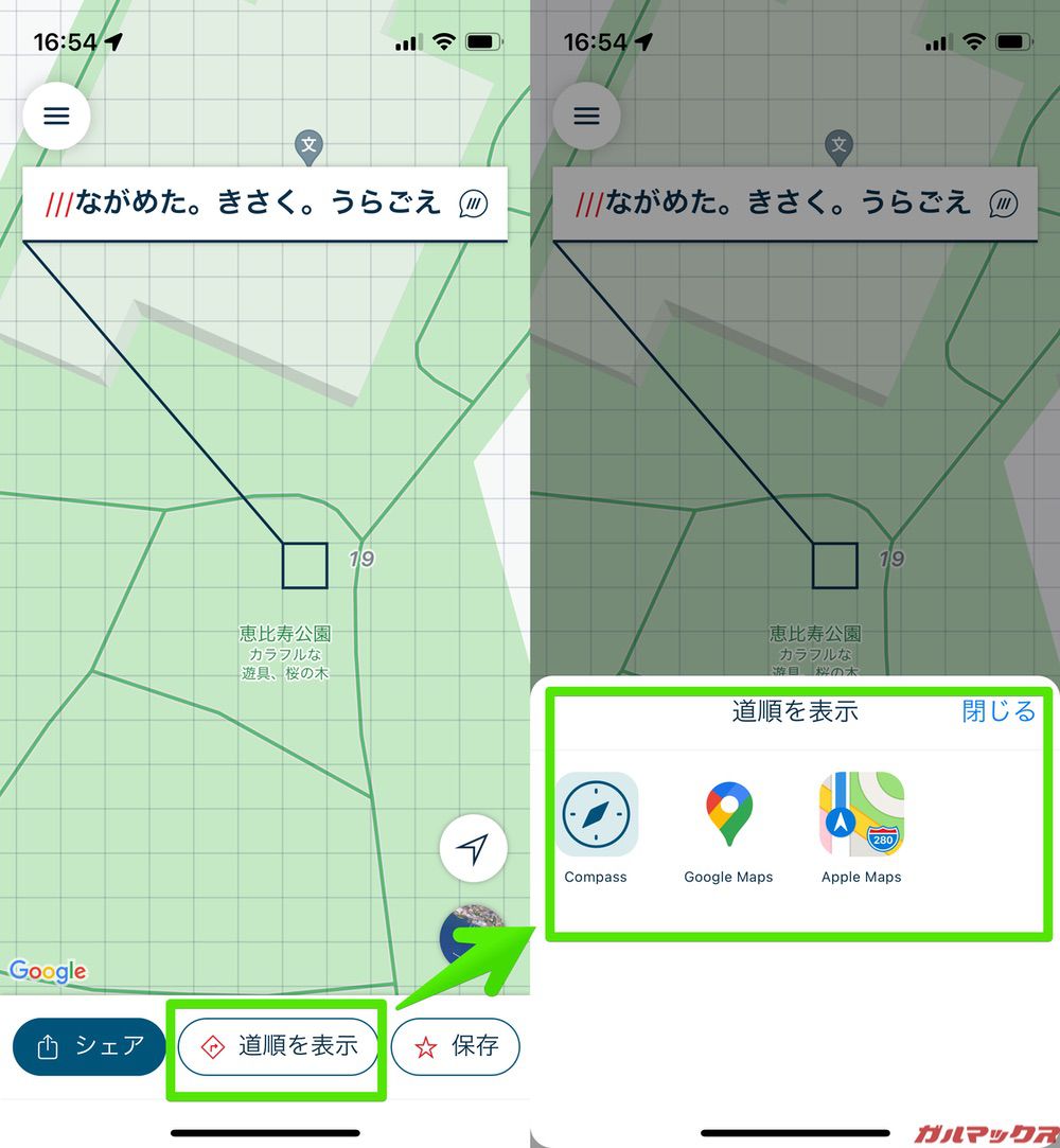▼「道順を表示」をタップするとGoogleマップやAppleのマップが選択できる。各マップアプリではスポットされた位置が目的地設定されているから、あとは各マップアプリのナビゲーション機能を使えばOK。↓