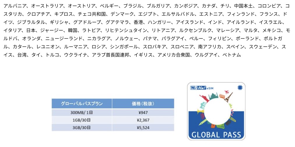 ▼続いて74ヶ国で利用可能なグローバルパス。様々な国で利用できるんですが、容量は300MB/1日/947円〜と値段がちょっと高め。(すみません、300GBと記載してました。。正しくは300MBです)↓