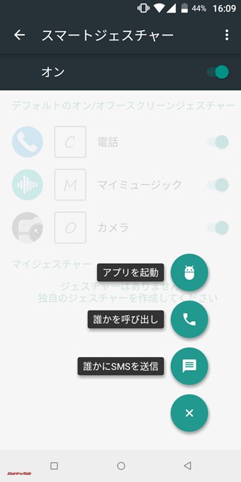 ▼ジェスチャーに対して選択できる動作は「アプリの起動」「電話で指定した人を呼び出し」「指定した人にSMS」が選べます。↓