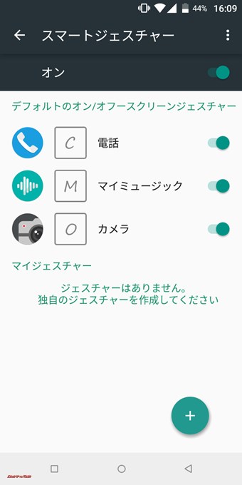 ▼初期状態では「C」が電話、「M」がマイミュージック、「O」がカメラに割り当てられています。下の「+」を押すことで独自のジェスチャーマークと、ジェスチャーに連動する動作を作成することが出来ます。↓