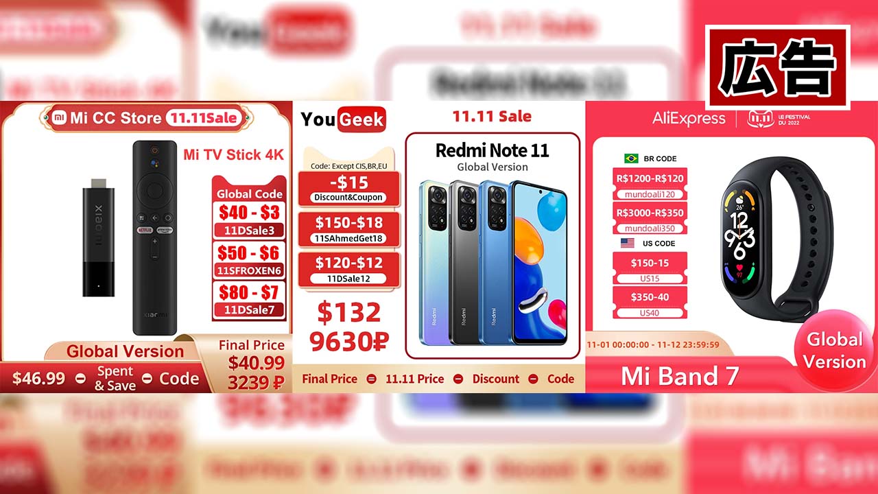 AliExpressでXiaomi製品が1111セールで値下げ中!Redmi Note 11やMi Band 7、そしてTV Stickが安くなっています。売りきれないうちに早めに手に入れておきましょう。