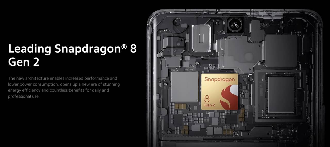 搭載するSoCは執筆時点で最新最強のSnapdragon 8 Gen 2を搭載!CPUは+37%も性能向上しつつ消費電力は-47%、GPUも+42%の性能向上に対し消費電力は-49%と飛躍的な進化を遂げているSoC!