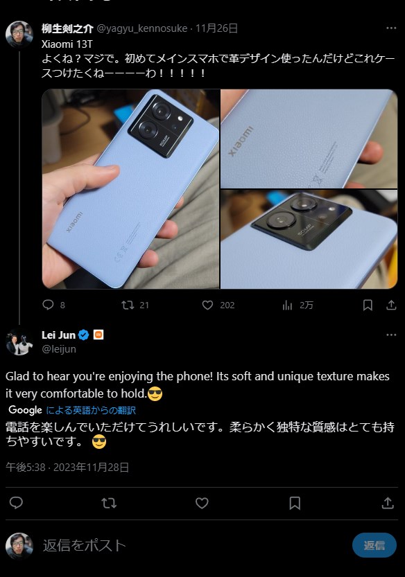▼おまけ。Xiaomi 13Tのファーストインプレを投稿したら、まさかのXiaomiのCEOである雷軍先生から返信飛んできた!!!心に直筆サインをもらった気分。感激で死にそう。大事にしよう。↓