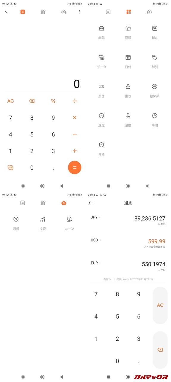▼Xiaomi 13Tにプリインされとる電卓は関数含めた様々な計算に対応しているのはもちろん、為替レートの換算もできるのが素晴らしい。↓
