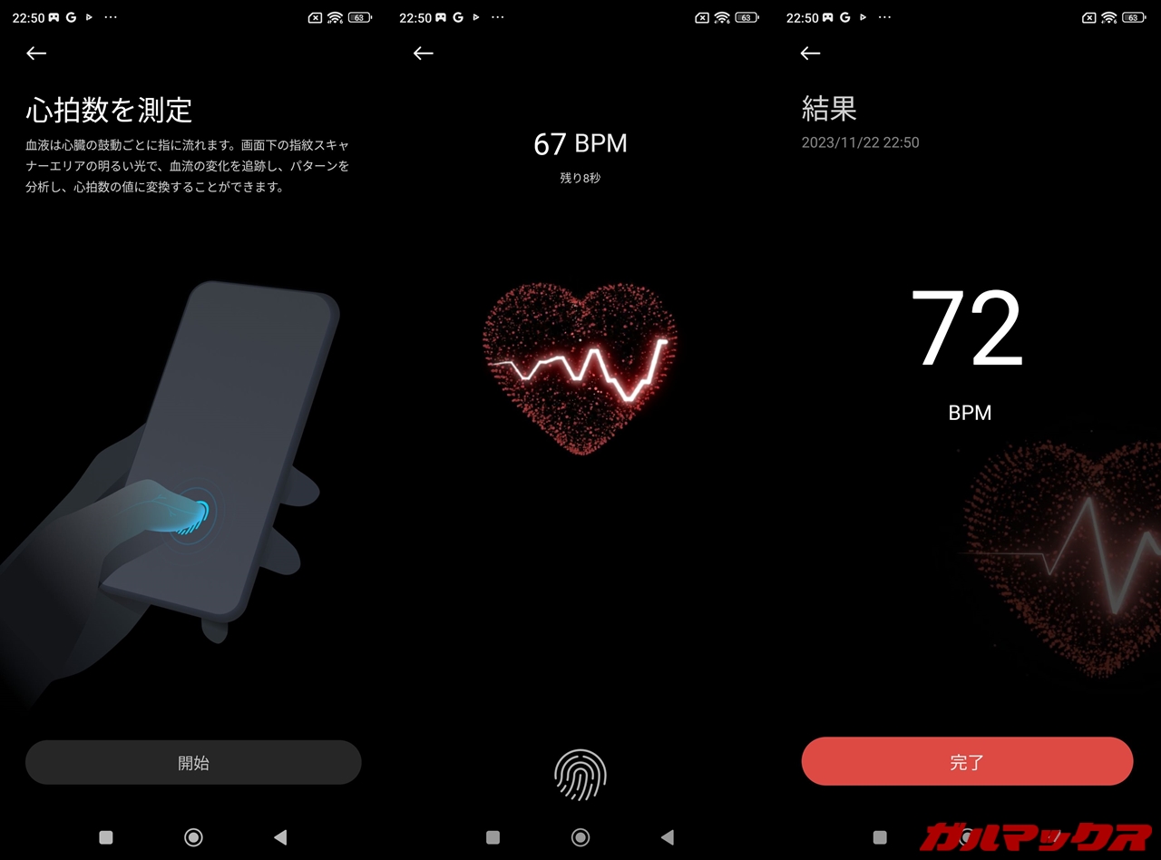 ▼Xiaomi 13Tの画面内指紋センサーを使って心拍数が測定でいるのも特色。この手の機能はXiaomiの一部モデルで見かけられますが他のメーカーでは筆者は見たことないなぁ。↓