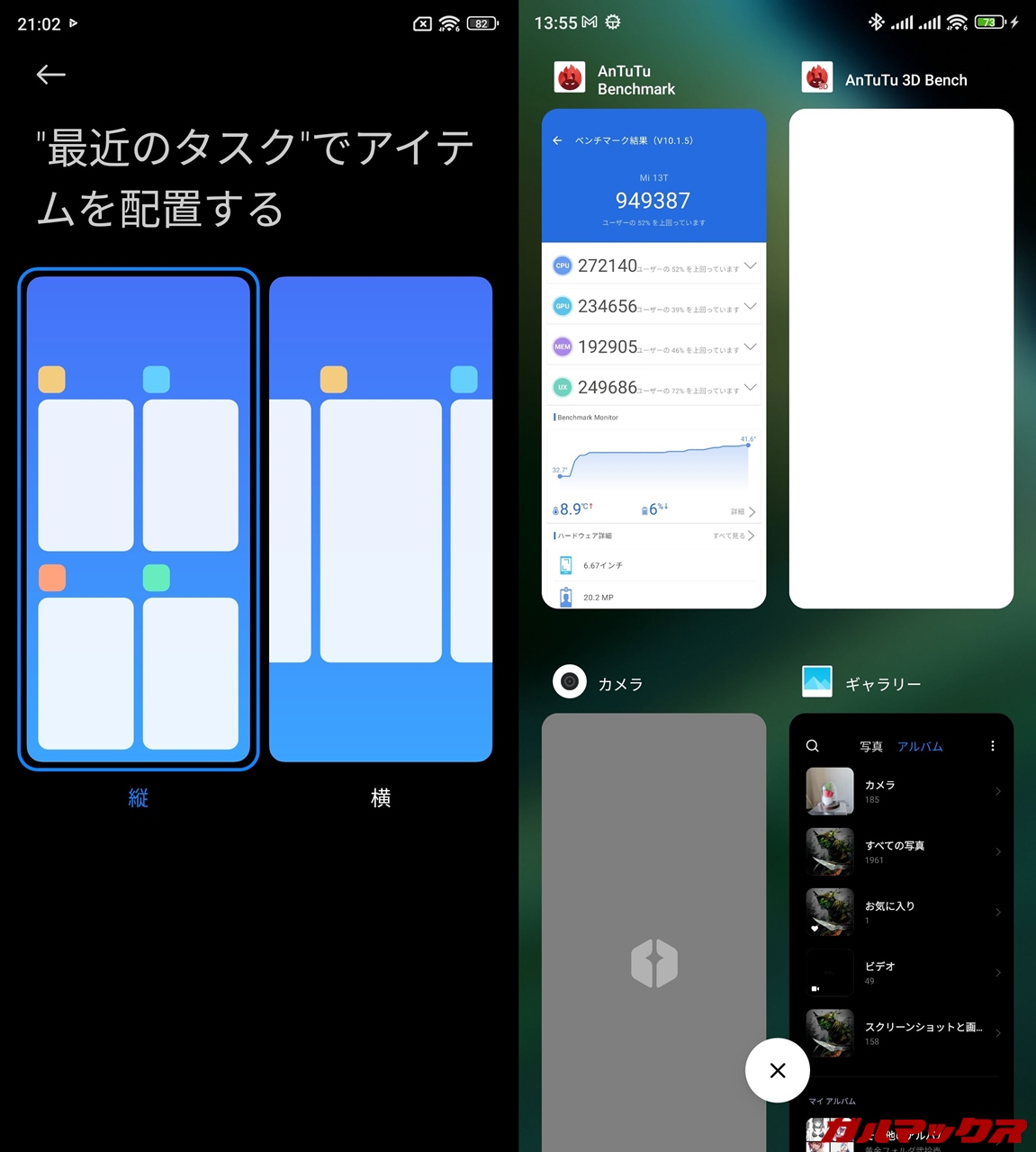 ▼アプリの履歴画面もMIUIならでは。こういう感じで横並びにアプリが並んでくれるんでどこにどのアプリがあるかがすぐわかって便利なんすよ。ちなみに従来式に戻すこともできます。↓