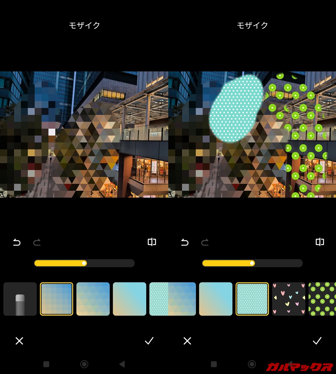 ▼あと地味に嬉しいのがモザイクもかけられること。ブラシツールでなぞった部分をモザイク加工できるんで、SNSに撮った写真を挙げたりこういうレビュー記事でスクショ貼るとき個人情報的なもんを隠すのにスッゲー便利。↓