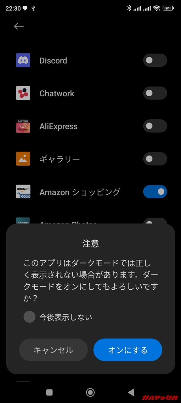 ▼あとダークモード対応はもちろんなんですが、本来ダークモードに対応しないアプリも強制ダークモード表示にできるのも魅力!↓