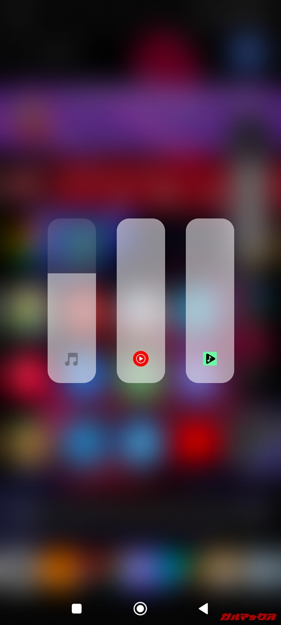 ▼さらにサウンド再生アプリごとに個別に音量調整が可能となってるのもGood。こういう感じでMusicolet(ローカル音楽再生プレイヤー)とYouTube Musicを同時に再生している場合、こんな感じで各々の音量を操作可能。↓