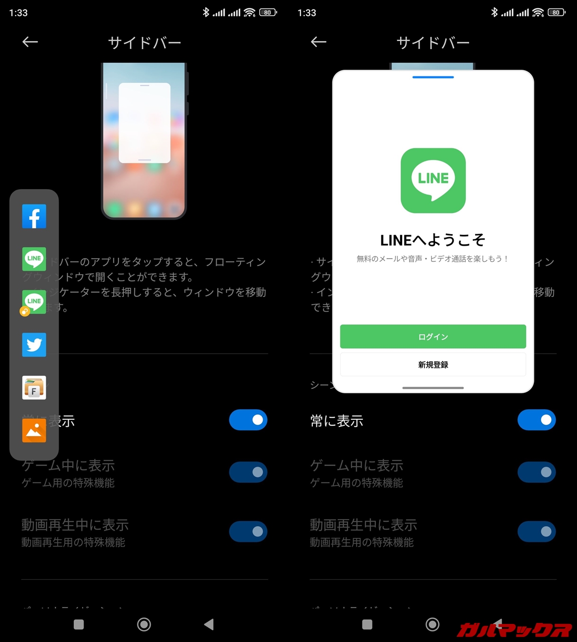 ▼サイドバー機能も対応し、それ経由で開いたアプリはフローティングウィンドウ表示で開くことができます。ちょいとSNSアプリを覗くとか音楽プレイヤーでリピート設定など操作をしたい時に便利だった。↓