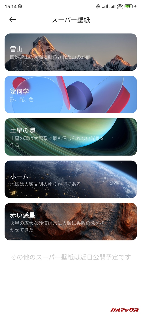 ▼デフォルトで内蔵されてるテーマアプリから「スーパー壁紙」を設定可能。この壁紙は背景が動くライブ壁紙と同じようなもので、ホーム画面でページを切り替えれば角度が変わって動きます。↓