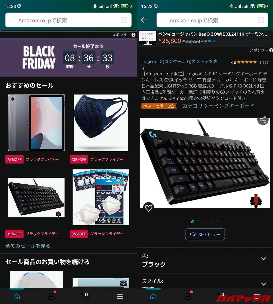 ▼たとえば筆者を買い物依存症に引きずり込むことに定評のあるAmazonアプリ。こんな感じで本来は白地背景ですが見事に黒字にできちまいます。スゴイっしょ。目に優しい。↓