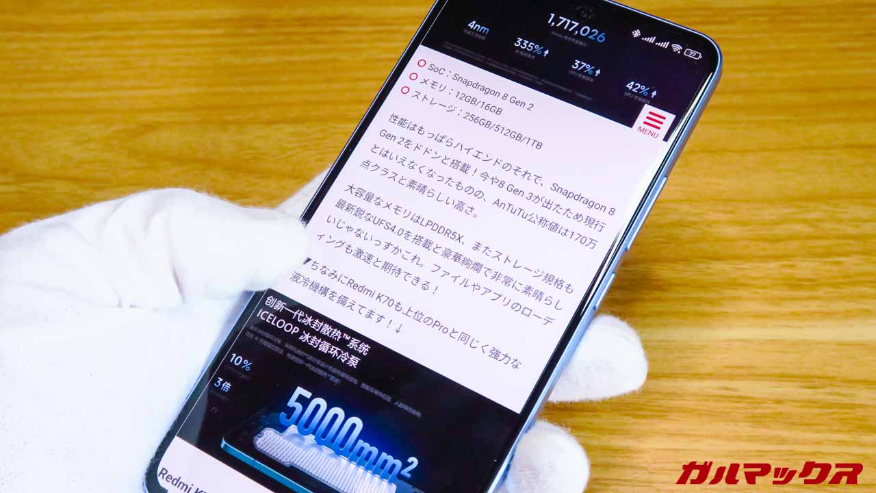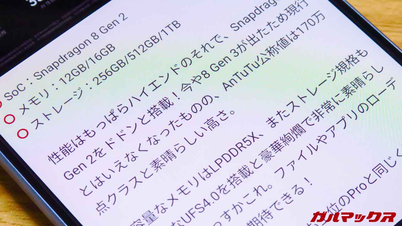 Dimensity 8200-Ultraのスペック自体はスコアの高さからもハイエンドクラスと遜色ないレベルで動作速度はすっげーサクサク。