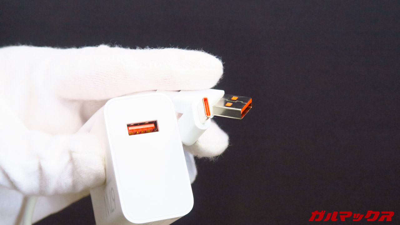 ▼ちなみにこの付属の充電器、67W充電対応のほか、端子にもしっかり赤いアクセントカラーがあしらわれててやる気を感じさせます。さながらシビックのType Rを彷彿とさせる。テンション上がるなァ~↓