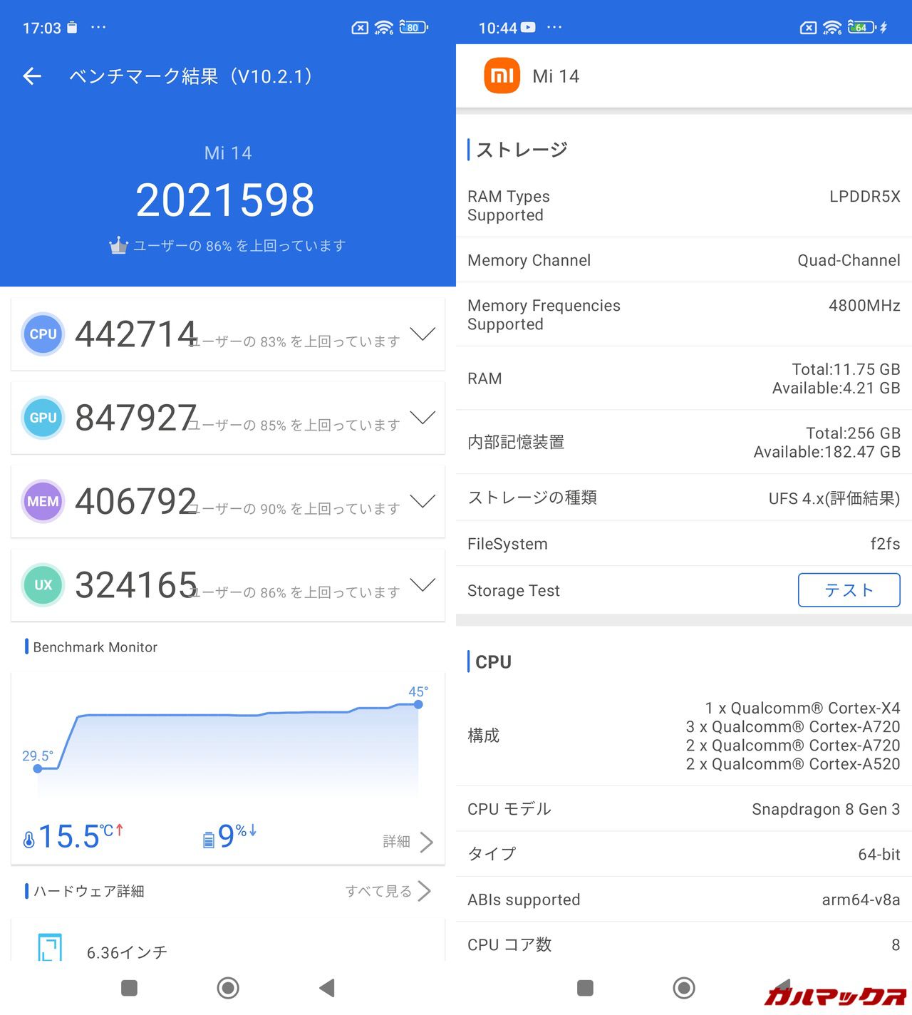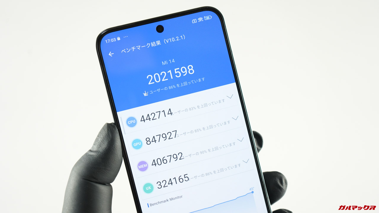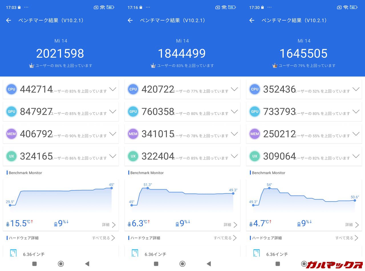 ほとんどのスマホは3回連続でAnTuTuをぶん回すとスコアは低下するんだが、Xiaomi 14は落ち幅が大きい。