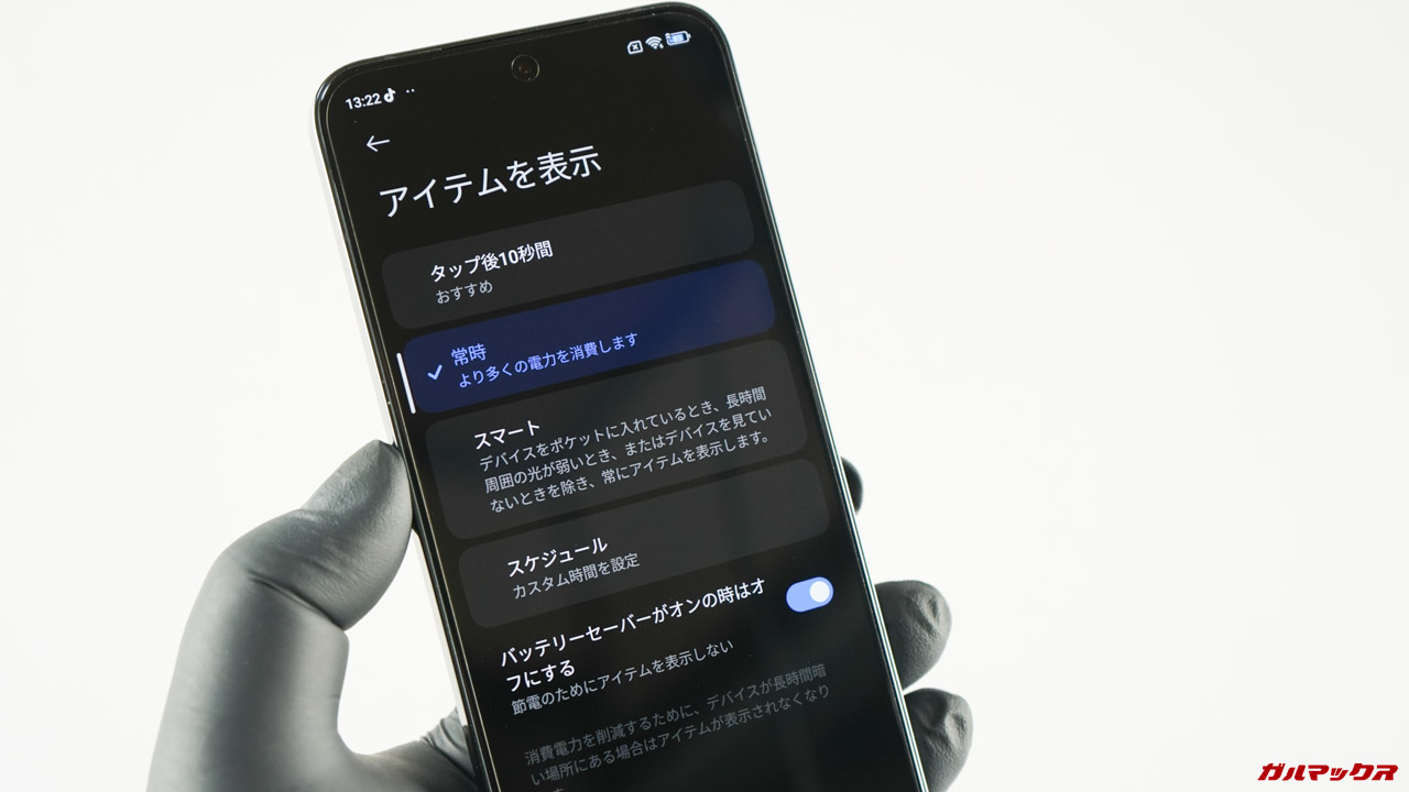 ▼ちな常時オンディスプレイの機能は対応していても機種によっては「タップ後10秒」しか選べない場合もあるが、Xiaomi 14はちゃんと「常時」を設定できた。↓