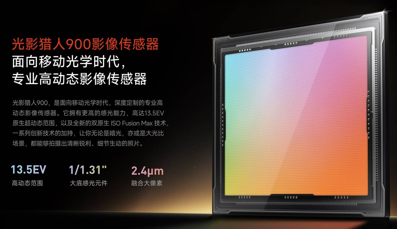 ▼メインカメラのセンサーも上位モデルと同じく1/1.31インチの大型センサー「光影猎人900」を搭載。ダイナミックレンジはIMX989の約8倍というモンスターっぷり。↓