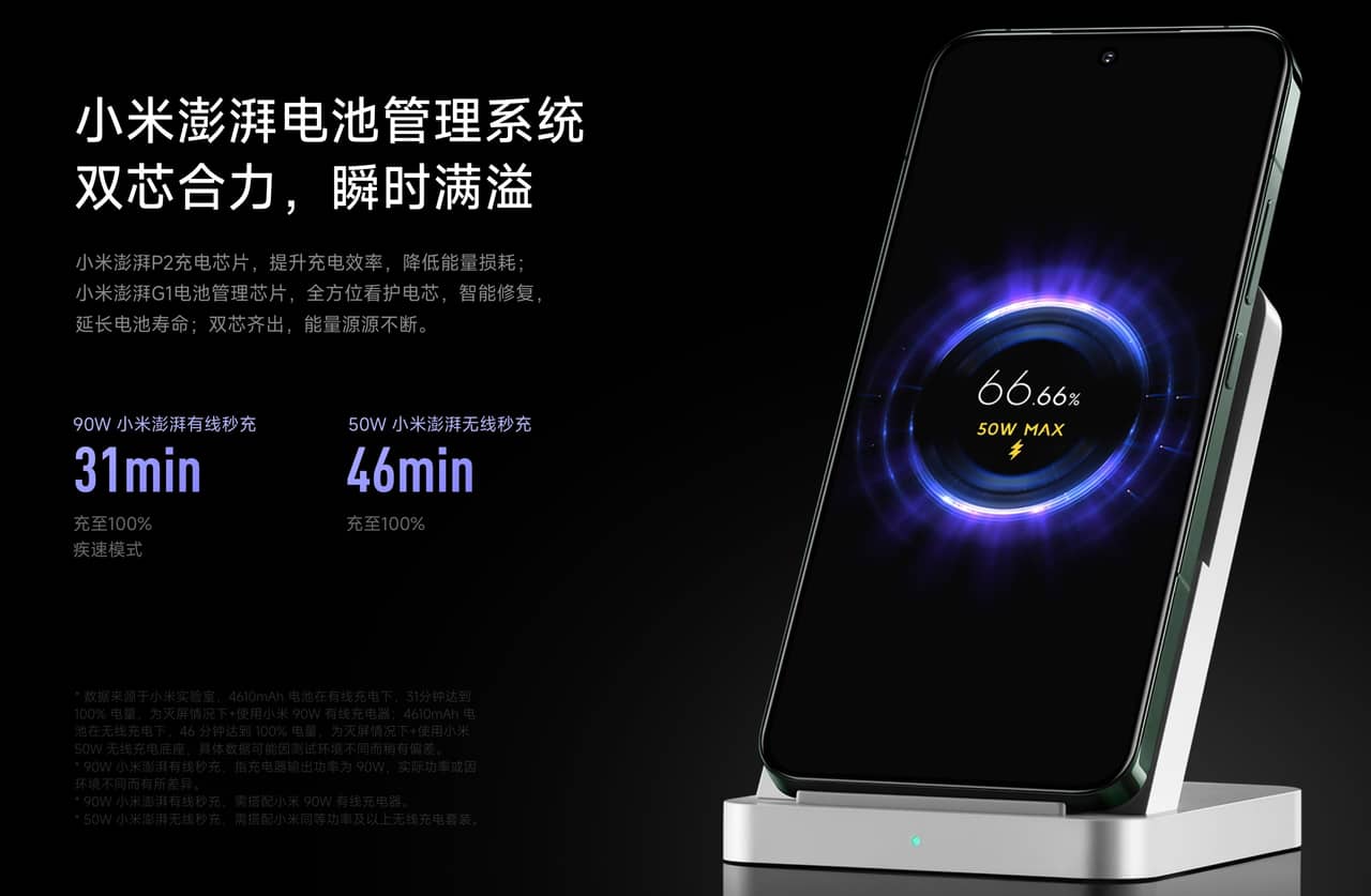 上位モデルはバッテリー容量がXiaomi 14より容量の多い4,880mAhで40分、一方、Xiaomi 14は4,610mAhで46分と記載されてます。容量が少ないのに充電時間が長いって事は電力効率も違ってきそうですね。