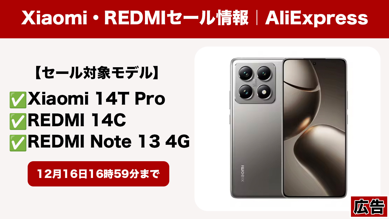 アリエク年末セール開催でXiaomi 14T ProとRedmi 14C、Redmi Note 13 4Gが安いぞ!