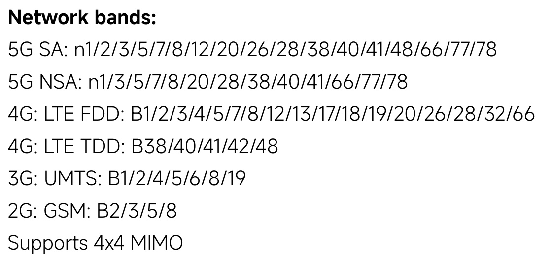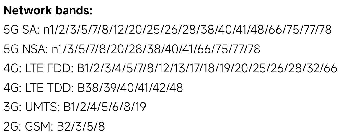 Sub6:n1 / n2 / n3 / n5 / n7 / n8 / n12 / n20 / n25 / n26 / n28 / n38 / n40 / n41 / n48 / n66 / n75 / n77 / n78 |
