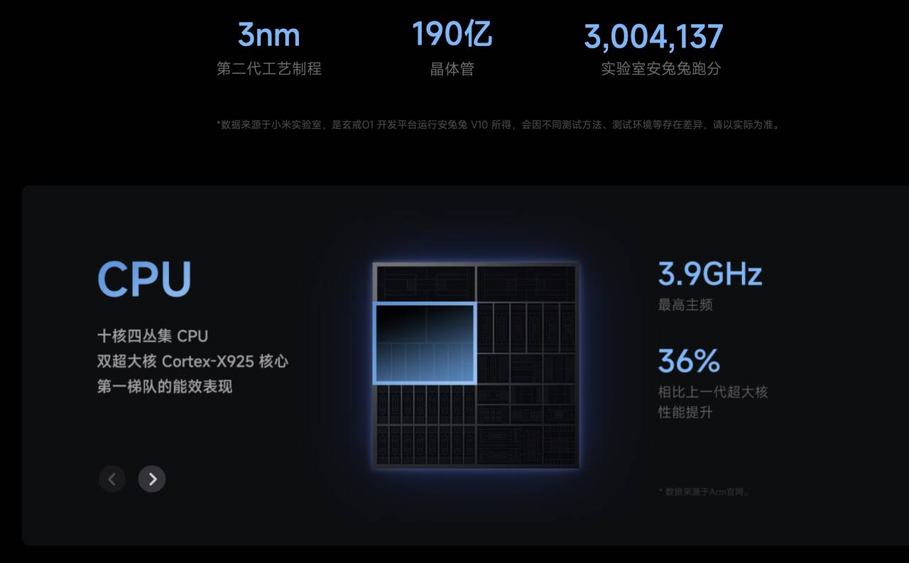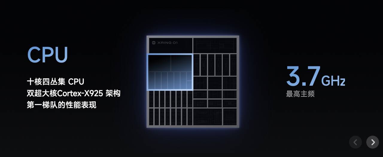 搭載するSoCは、なんとXiaomi独自開発の「XRING O1」を搭載。3nmプロセスルールで製造されたSoCで、最高周波数は3.9GHzに達します。AI処理を行う6コアNPUは44TOPSとのこと。