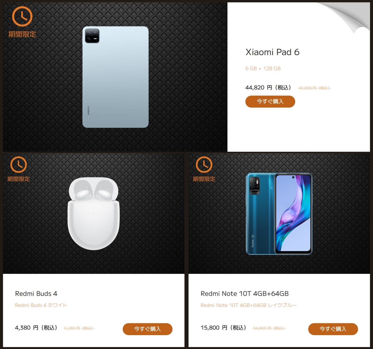 ただXiaomi Pad 6(ブルー)、Redmi Buds 4は上のセール製品まとめリストにも入っていました。