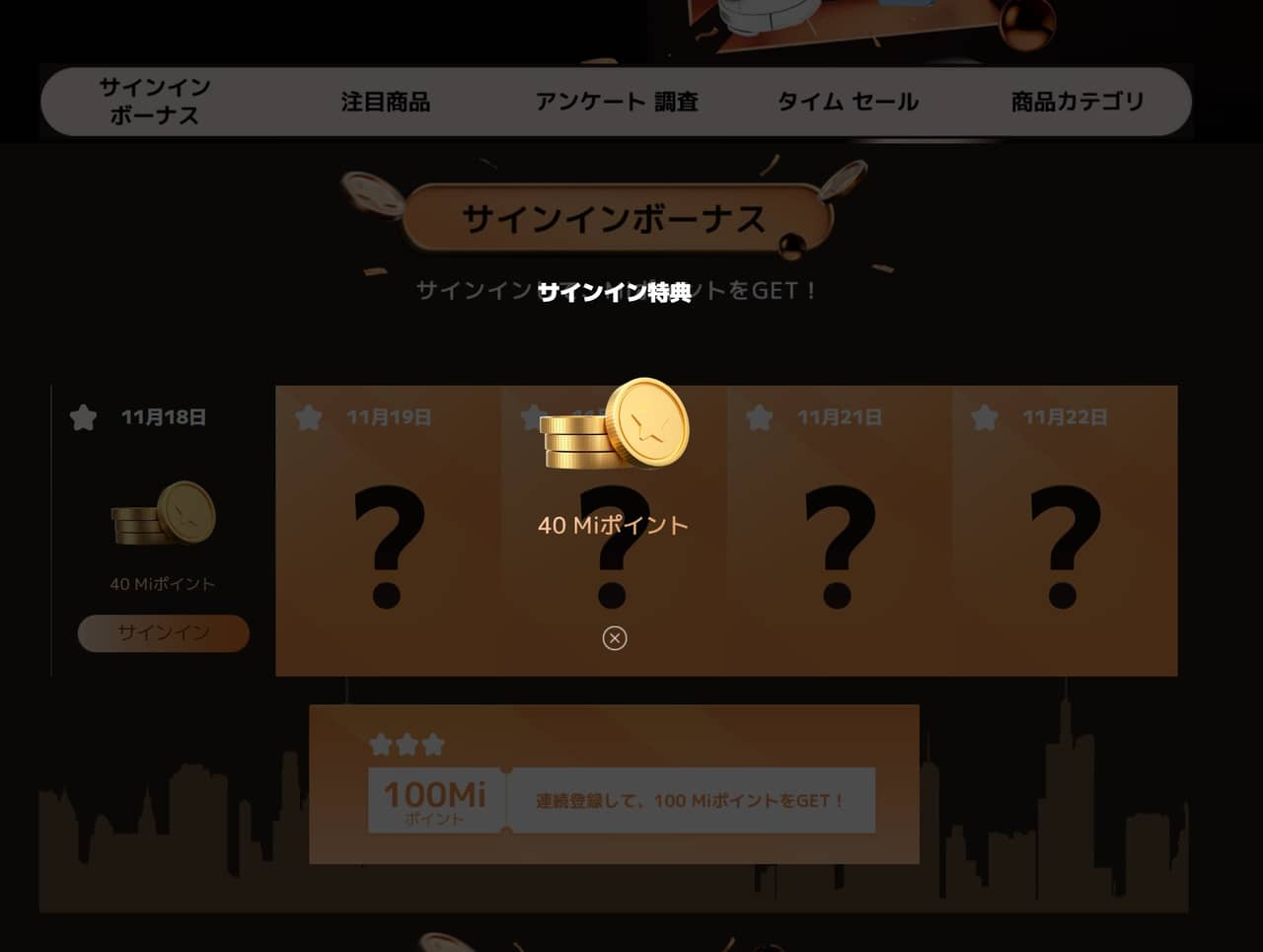 ▼そして最後に。Xiaomi公式サイトでは、Miアカウントを作ってサインインをすれば割引クーポンと引き換えられるMiポイントももらえるんで、ログインボーナス的な感じで毎日サインインしときましょう。↓