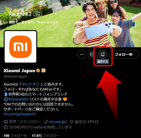 ▼筆者としては公式アカウントをフォローしたあと、赤枠のベルマークボタンを押して通知するように設定するのがオススメ。↓