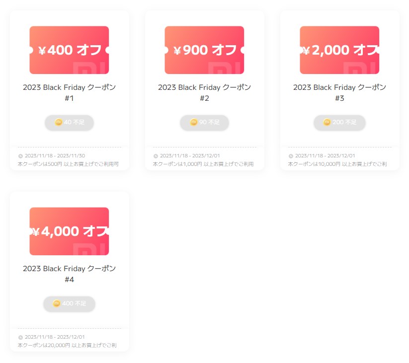 ▼ただポイントは直接購入の補助にはならんので注意。40、90、200、400ポイントごとにクーポンに交換可能なタイプです。あと、400円クーポンのみアクセサリーには使えない模様。↓