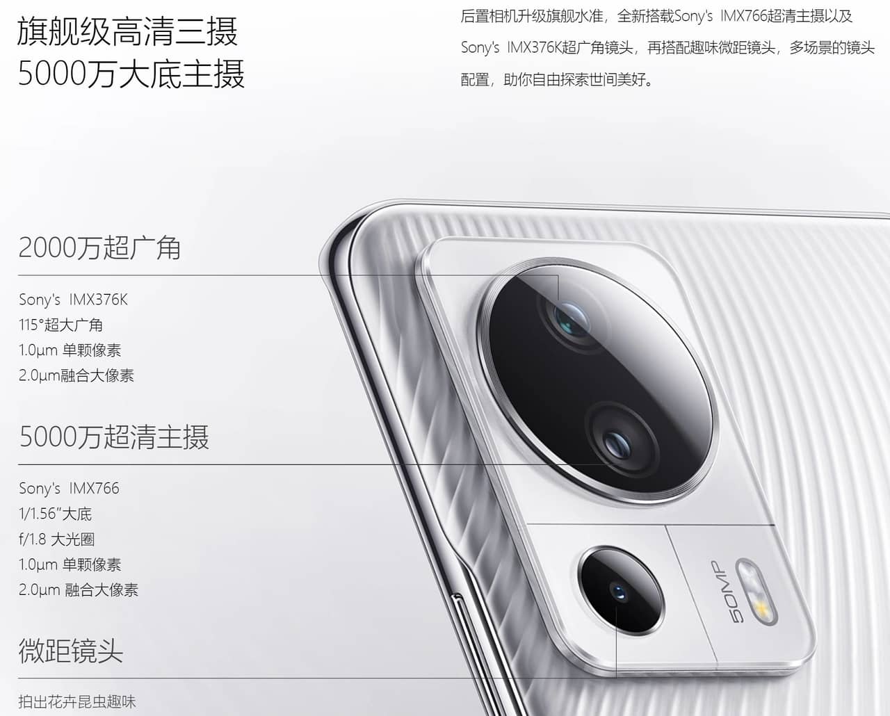 ▼アウトカメラは5,000万画素のメインカメラ、2,000万画素の超広角カメラ、そして200万画素のマクロカメラという構成。メインカメラのセンサーはSONY IMX766センサーで大型サイズのものを採用しており写真もとってもキレイに撮れそう!↓
