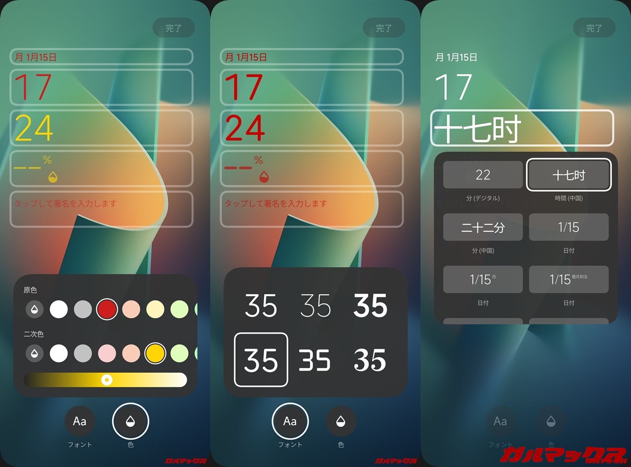 ベースのAndroidよりも細かいカスタマイズができ、それぞれの行ごとに時、分の配置、またカラーリングもベースとセカンドカラーの2色まで変えられるようになっています。筆者が検証したところ、セカンドカラーは上から3~4行目までの適用となっています。