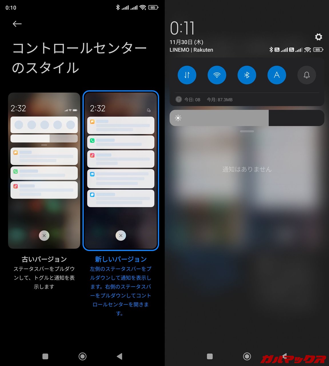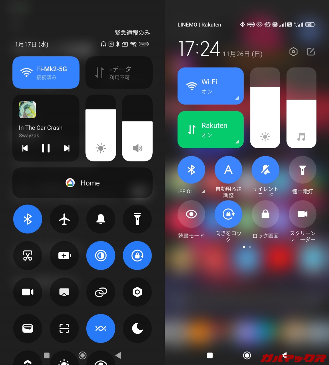 ▼筆者的には一番大きな変更点、それが通知コントロールメニュー。左がXiaomi HyperOS、右がMIUI。↓