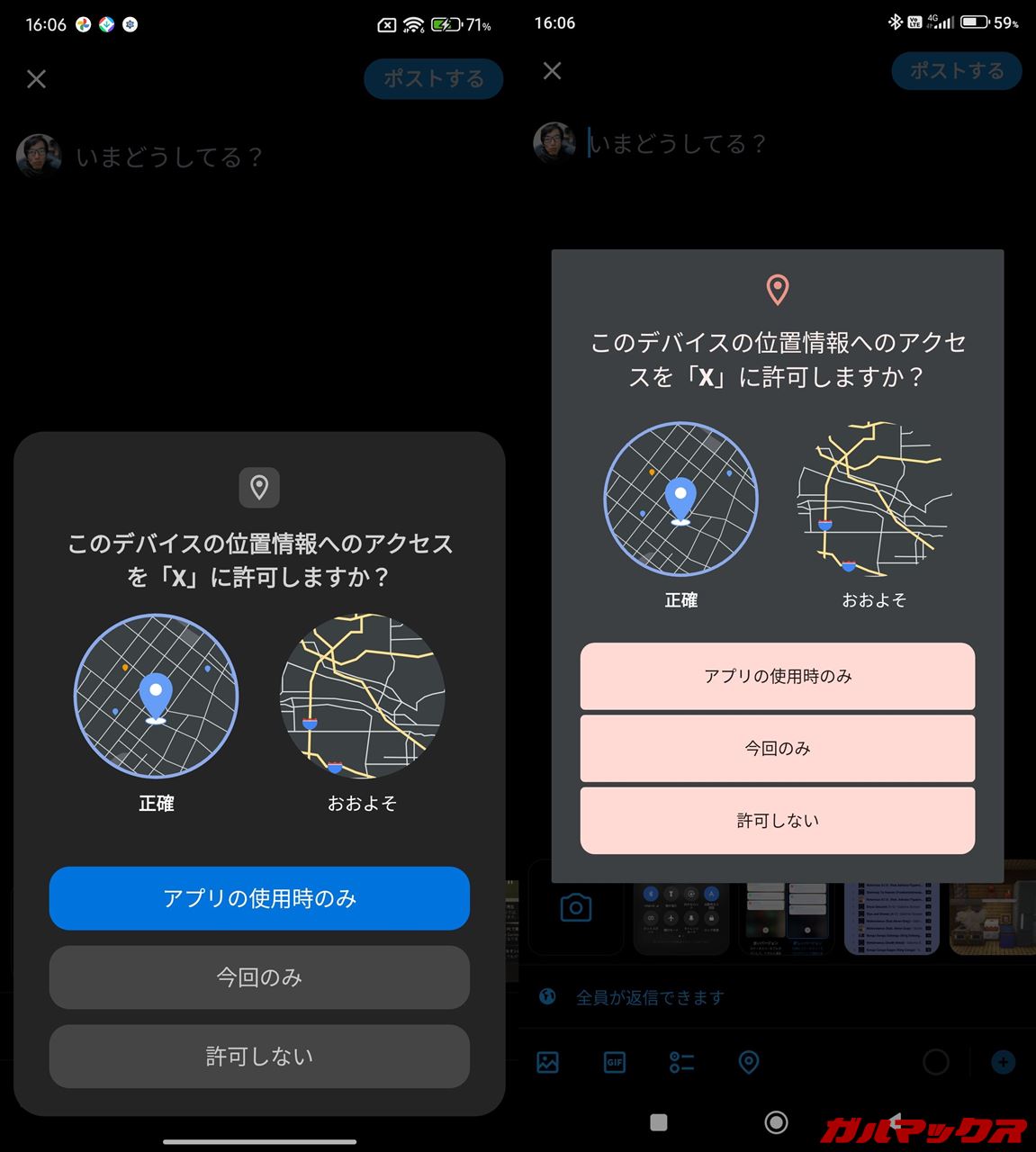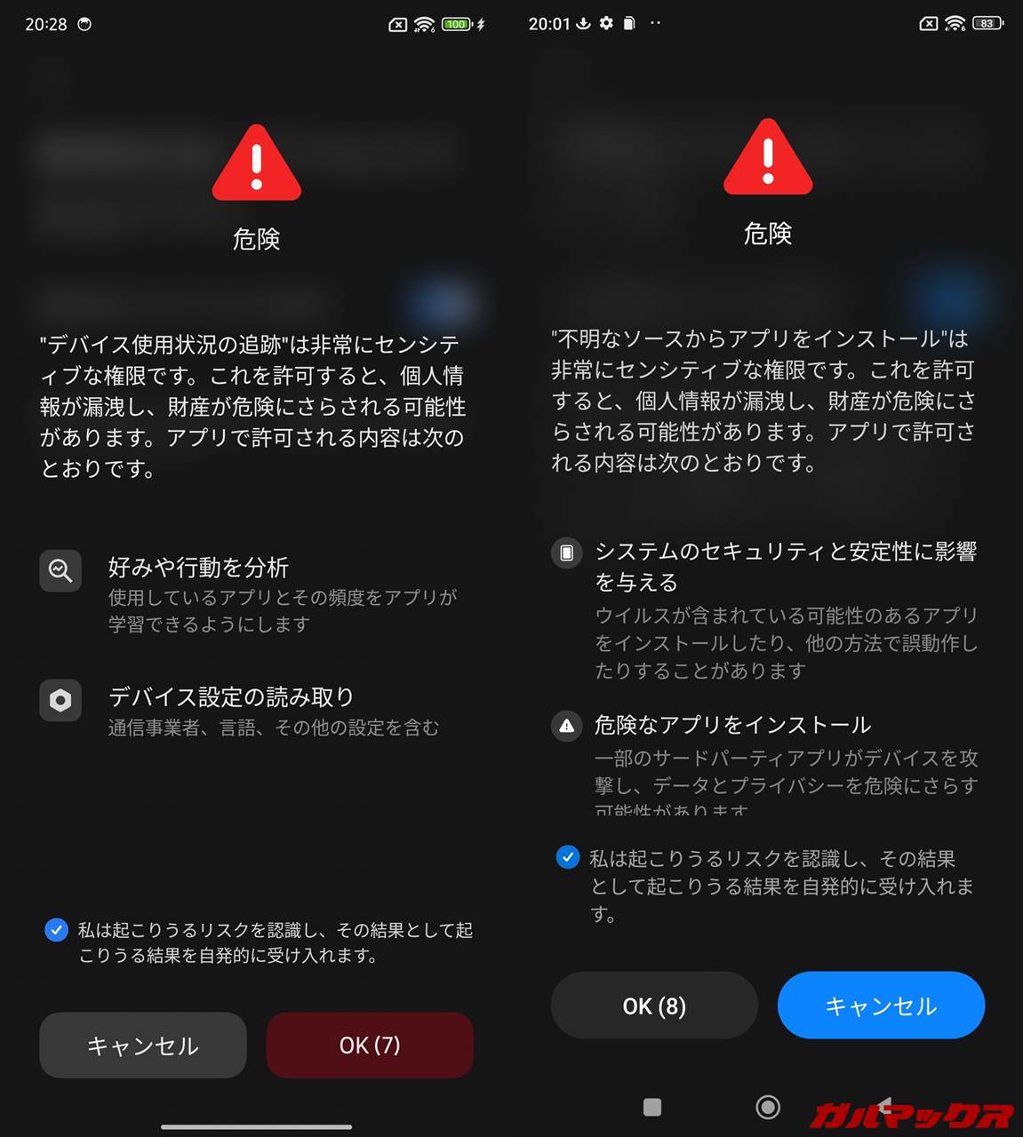▼細かい違いですが、権限の許可をするか否かの画面も変わっています。左がXiaomi HyperOS、右がMIUI。↓