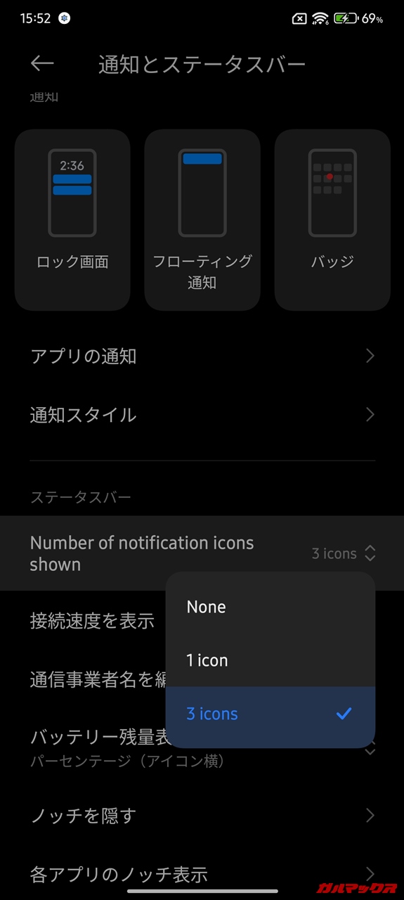 筆者的には3つ以上、画面いっぱいまで表示できるようになって欲しいのですが現時点ではできませんでした。1つのみ表示したところでだから何だって思うんだけど、通知アイコンをなるべくスッキリさせたい、って人にとっては良い設定項目かもしれません。