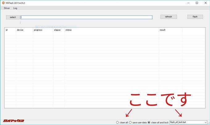 ▼右下の項目はClean Allを選択、その右にあるモノはflash_all.batにしておきました。これで正規のソフトウェアがインストール後に初期化状態になるはずです。(今回はスマートフォン側でも初期化を行った上でソフトウェアのインストールを行っています。何かが起こると結構面倒なので、初期化してからの実行がベストかと思います。また、GoogleアカウントやXiaomiのアカウントからの紐付け外しもお忘れ無く。)↓