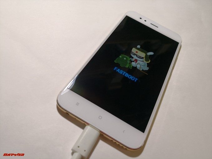▼次にMi 5Xを接続します。電源を一度OFFにし、音量下ボタンと電源ボタンを同時押しして画面にFASTBOOTの文字と画像のようなイラストが出るまで押し続けます。↓