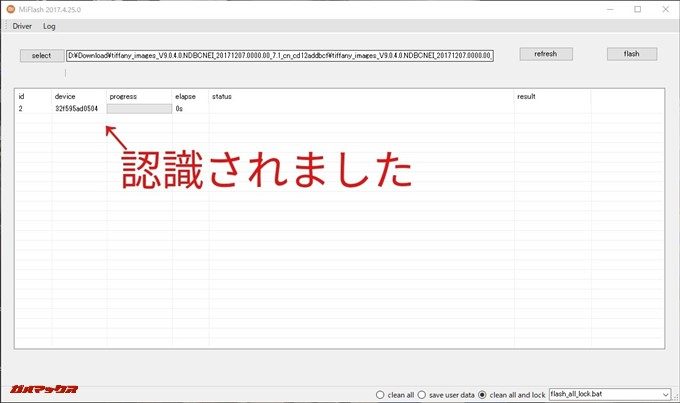▼その後、USBケーブルでパソコンと接続し、MiFlashのRefreshボタンをクリックし、MiFlashがMi 5Xを認識していることを確認したらFlashボタンをクリックします。「Progress」が最後まで進むまでノータッチで放置し、その後Mi 5Xが初期化された状態で起動していれば問題なく正規ソフトウェアへ変わっているはずです。お疲れ様でした。↓