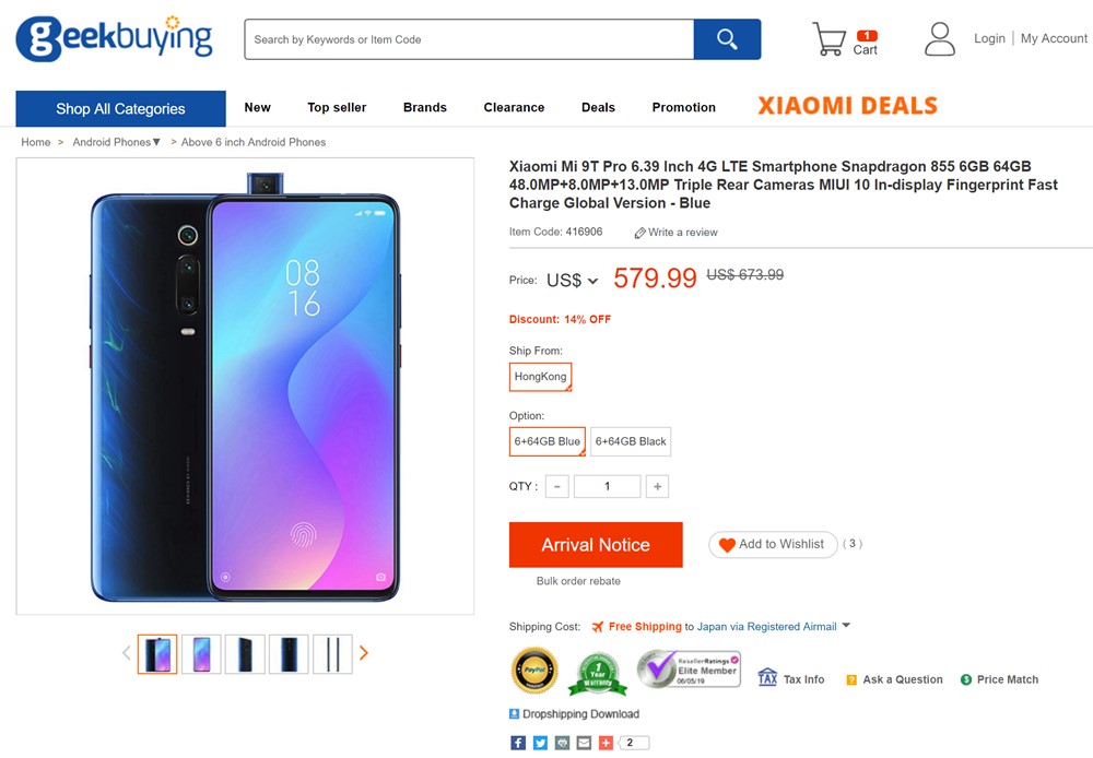 ▼以下はGeekbuyingで見つけたXiaomi Mi 9T Proの詳細ページ。価格はなんと579.99ドルで円換算だと6.2万円。ちなみにこれ、メモリ6GB/容量64GBの一番安いモデル。お賽銭価格だとは思いますが、とっても高いです。