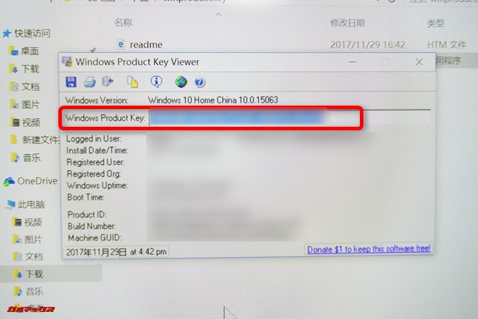 ▼ウィンドウが立ち上がるので[Windows Product key]に記載されているプロダクトキーをスマホカメラで撮影するなりしてメモっときましょう。↓