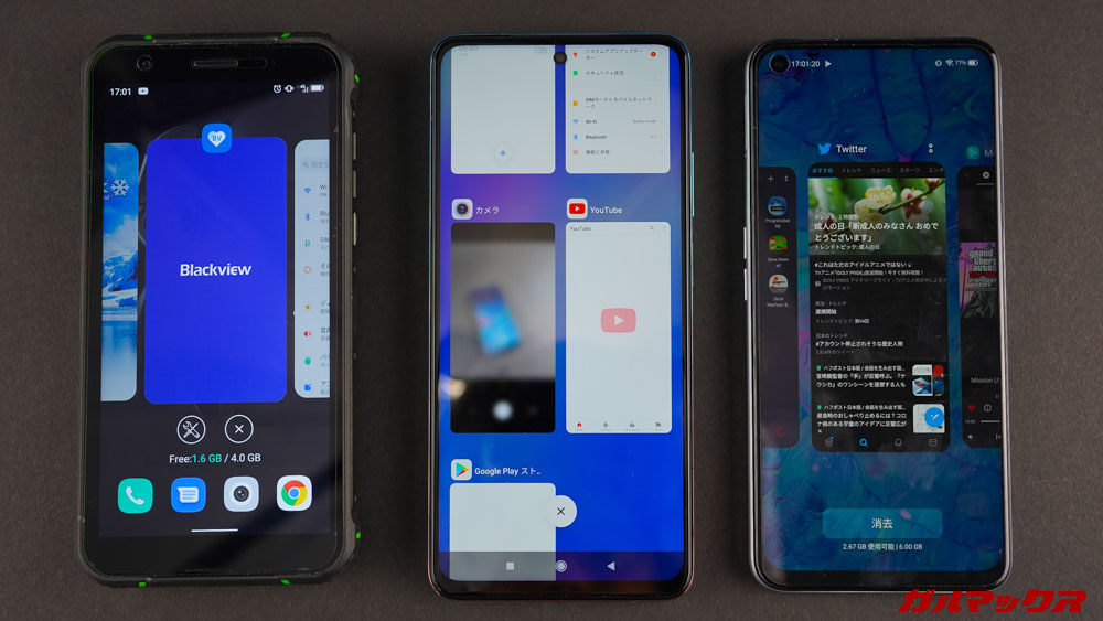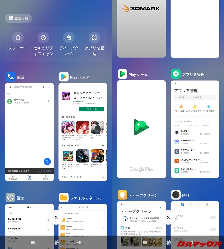 ▼MIUI一番の特徴ともいえるのが「アプリ履歴画面」。通常のスマホでは、アプリのカードが「横並び」に配置される形式なんですが、MIUI 12は全然違います。アプリカード一覧がそのまんまタイル状に並べられる形式なんです。↓