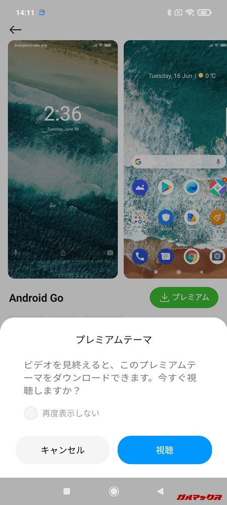▼「プレミアム」のテーマは、広告動画を視聴することでダウンロードして使うことができます。まるで無料ゲームみたい。オッサンが毎回小舟でサメと溶岩に襲われる広告動画に我慢すれば、無料でいろんなテーマが使えるのは結構嬉しい。↓