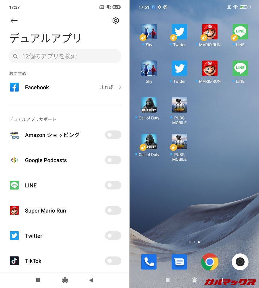 ▼LINE、TwitterといったSNSアプリはもちろん、Skyやマリオランといったゲームまで幅広くアプリを複製して使えるんです!この点は流石MIUIといえるポイント。ゲームの2アカ利用もお手の物です。↓